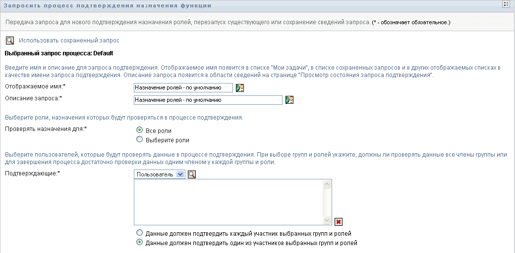 Действие позволяет инициировать процесс подтверждения с целью проверки точности назначения выбранных ролей. Оно также позволяет сохранить данные, связанные с запросом на подтверждение (например, значения параметров и данные формы) в виде уже заполненной формы для дальнейших запросов.