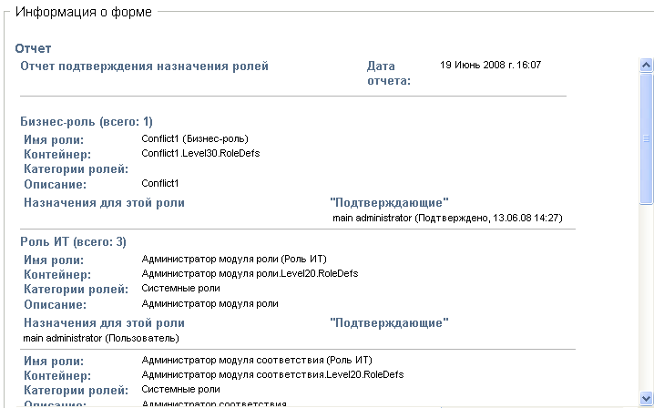 Для процессов подтверждения назначения ролей, назначения пользователей и SoD форма содержит отчет, показывающий данные, подлежащие просмотру: