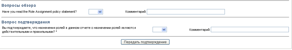 При рассмотрении задачи, связанной с запросом подтверждения, вам необходимо просматривать сведения, отображаемые формой подтверждения. Дополнительно, вам необходимо ответить на требуемый вопрос о подтверждении, что показывает, подтверждаете ли вы правильность данных, и, в ряде случаев, ответить на один или несколько вопросов опроса. Для процессов подтверждения профилей пользователей форма содержит параметры вашего пользовательского профиля, которые вам следует проверить на точность. Для процессов назначения ролей, назначения пользователей и подтверждения SoD форма содержит отчет, в котором показано назначение ролей, назначение пользователей или данные SoD, которые требуется проверить.