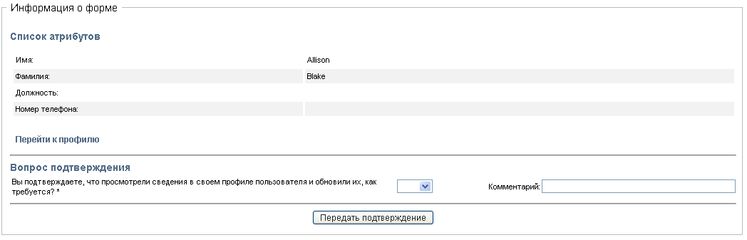После обновления раздел страницы будет содержать форму подтверждения. Внешний вид формы меняется в зависимости от типа подтверждения. Для процессов подтверждения профиля пользователя форма показывает данные профиля пользователя, которые вам требуется просмотреть: