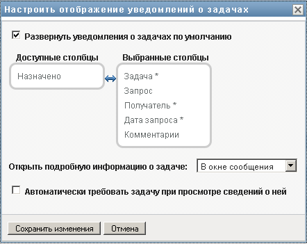 User Application откроет диалоговое окно "Настройка отображения уведомлений о задачах", в котором можно настроить вид списка задач. Набор доступных элементов управления меняется в зависимости от того, какие настройки администратор сделал доступными для перезаписи пользователем.