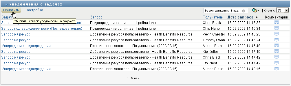Для запросов на ресурсы и роли столбец в списке задач определяет пользователей или группы, которые получат данный ресурс или роль, если будет получено запрашиваемое подтверждение. Для запросов на подтверждение в столбце указано имя подтверждающего.