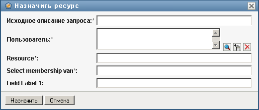 Теперь диалоговое окно "Добавление ресурса" показывает выбранный ресурс, а также другие поля, определенные в форме запроса о ресурсе: