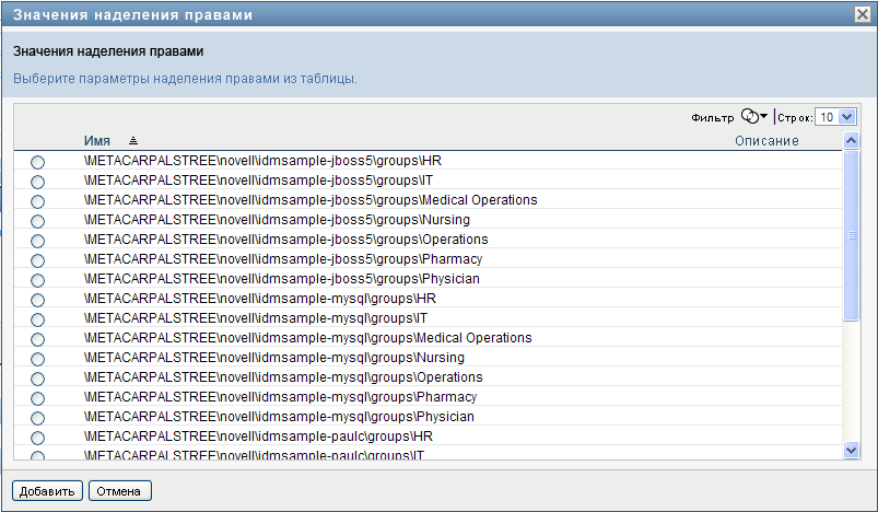 Если ресурс требует значение параметра наделения правами, необходимо с помощью элемента "Выбор объектов" указать значение, которое Вы хотите использовать для назначения этого ресурса, как показано ниже: