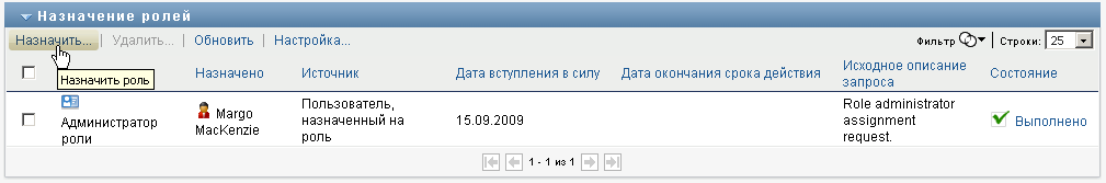 Откроется список ролей. Если Вы не находитесь в управляемом режиме, показываются назначения ролей, для которых Вы являетесь получателем.