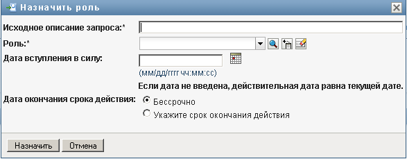 Если в элементе ничего не выбрано, список назначения ролей показывает назначения текущего пользователя. Эти назначения ролей включают те, для которых текущий пользователь является адресатом, а также роли, получателем или адресатом которых являются группа, контейнер или роль, к которым он принадлежит. Пользователь может выполнять любые действия над своими назначениями ролей, т. к. для работы со своими ролями не требуется никаких прав.