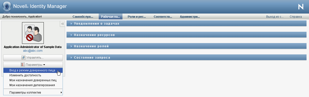 Действие Вход в режим доверенного лица позволяет действовать в качестве доверенного лица другого пользователя.
