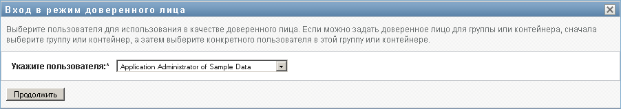 2. Выберите пользователя, в качестве доверенного лица которого хотите действовать, и щелкните Продолжить.