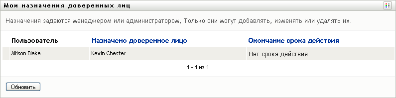 Если Вы не являетесь администратором обеспечения правами доступа, менеджером обеспечения правами доступа или менеджером группы, Вы сможете просматривать назначения доверенных лиц в режиме "только для чтения":