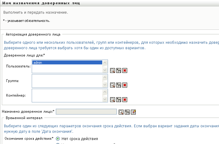 Администраторам приложения обеспечения правами доступа приложение User Application предоставляет следующий интерфейс, позволяющий определять назначения доверенных лиц:
