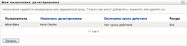 Если Вы не являетесь администратором обеспечения правами доступа, менеджером обеспечения правами доступа или менеджером группы, Вы сможете просматривать назначения делегатов в режиме "только для чтения":