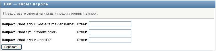Сразу же после входа в Identity Manager User Application Вы можете получить запрос и на другие сведения. Это зависит от того, как системный администратор настроил Вашу политику пароля (при его наличии). Пример: