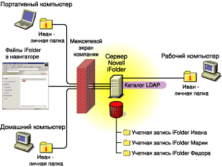 Иван выполняет аутентификацию в сервере iFolder с помощью LDAP версии 3. Иван может обратиться к данным iFolder из дома, с работы или из любого места с помощью навигатора. При работе на локальном компьютере он обращается к данным локально. Сервер iFolder ответственен за размещение самой последней версии данных Ивана на всех его компьютерах. Обращаясь к своей учетной записи с помощью навигатора, Иван фактически просматривает данные, хранящиеся на сервере iFolder.