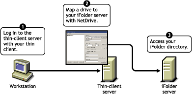 После инсталляции NetDrive на сервере "тонкого" клиента мобильные пользователи могут использовать NetDrive для назначения диска на сервер iFolder, таким образом сделав доступной копию данных сервера iFolder через проводник Windows. (Для визуального представления этого процесса см. Действие 9.)