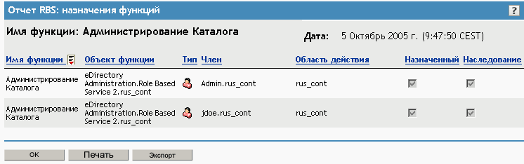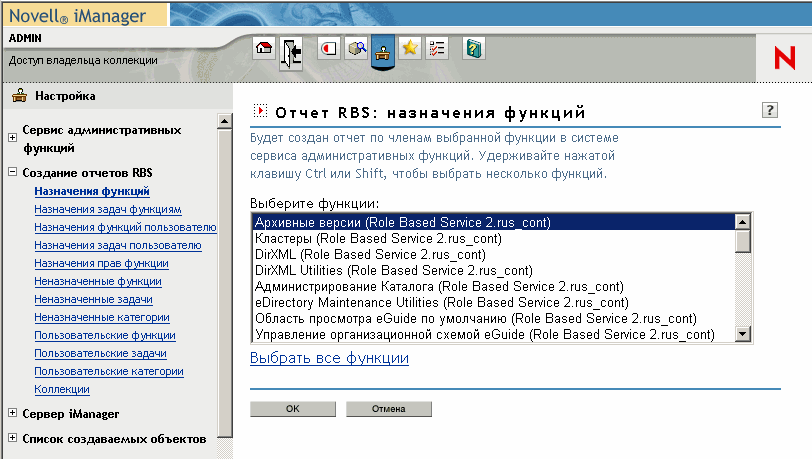 Для формирования любого отчета требуется ввести некоторую начальную информацию, например, указать функции, для которых необходимо сформировать отчет о назначенных членах. После ввода нужной информации и нажатия кнопки "ОК" iManager формирует отчет.