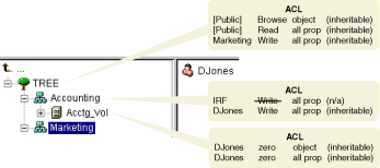 For example, if the trustee's effective rights so far include the Create and Delete object rights but no property rights, and if the ACL at this level contains both an assignment of zero object rights and an assignment of Write all properties for this trustee, then the system replaces the trustee's existing object rights (Create and Delete) with zero rights and adds the new all property rights.