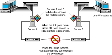 If you have more than one eDirectory server on your network, you can keep multiple replicas (copies) of the directory. That way, if one server or a network link to it fails, users can still log in and use the remaining network resources. See Figure 20. For a complete discussion of replicas, see Managing Partitions and Replicas.