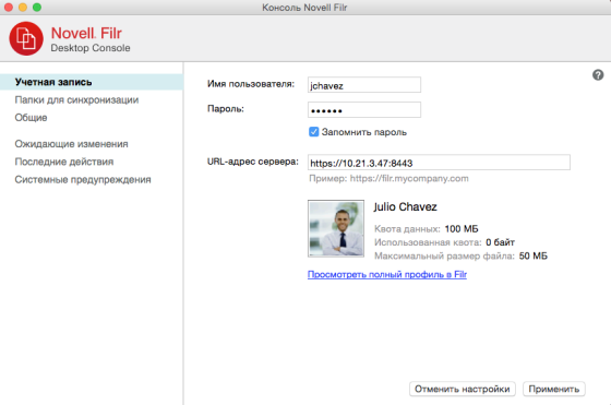 URL-адрес сервера. Укажите URL-адрес сайта Filr, на котором нужно синхронизировать файлы с вашим компьютером. Например, https://Filr.mycompany.com:8443.