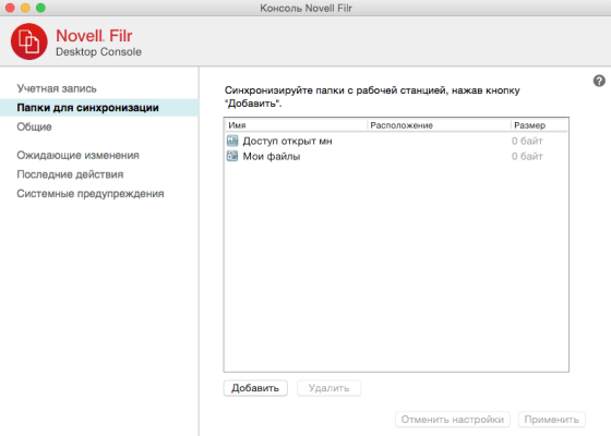 При первой настройке приложения Filr для настольного компьютера можно выбрать папки, которые будут синхронизироваться. Папки "Мои файлы" и "Доступ открыт мне" синхронизируются по умолчанию; для синхронизации сетевых папок и общедоступных папок их необходимо настроить вручную. Можно настроить папки для синхронизации при начальной конфигурации или в любое время после ее выполнения.