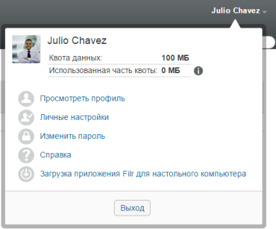 Ссылка на имя. Щелкните ссылку с именем в верхнем углу любой страницы Filr, чтобы просмотреть перечисленные ниже параметры.