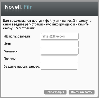 Чтобы войти в систему, пользователь должен зарегистрироваться на сайте Filr. В приложении Filr версий более ранних, чем 1.1, пользователи могли входить на сайт Filr, используя учетную запись Google или Yahoo. Эта функциональность больше недоступна для новых пользователей Filr в версии 1.1 и более поздних. Дополнительные сведения см. в файле Novell Filr 1.1 Readme.)