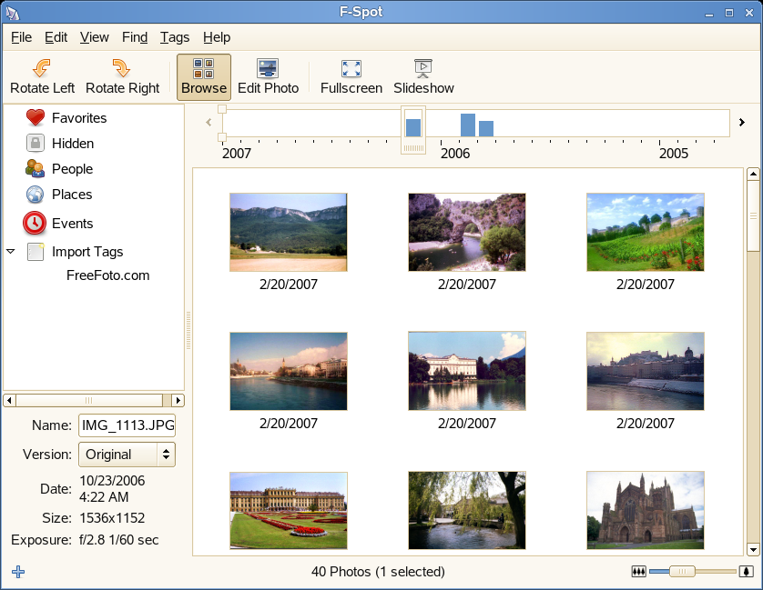Вы можете импортировать фотографии с жесткого диска, цифрового фотоаппарата или iPod*. F-Spot также можно использовать для создания компакт-дисков с фотографиями, генерации галереи для веб-сайта или для экспорта фотографий в Flickr, 23, Picasa Web или SmugMug.