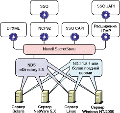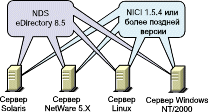 Для серверов Solaris и Linux необходимо программное обеспечение NDS eDirectory 8.5 или корпоративная версия NDS 8.5. (NICI инсталлируется автоматически при инсталляции сервера.)