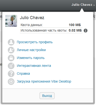Ссылка на имя. Щелкните ссылку с именем, которая находится в правом верхнем углу любой страницы Vibe, чтобы просмотреть параметры, которые перечислены ниже.