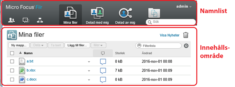 När du startar Filr i en webbläsare visas sidan Mina filer. Du kan hantera alla filer du har skapat från den här sidan.