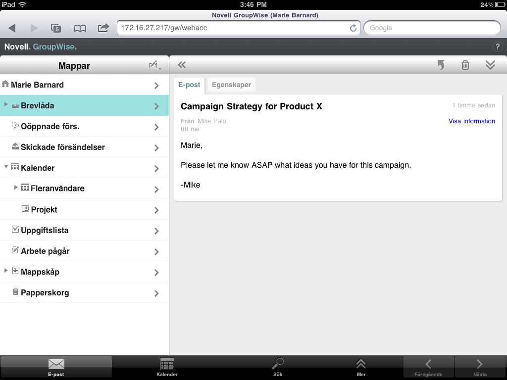 När du loggar in i GroupWise från webbläsaren på en pekplatta visas din brevlåda.