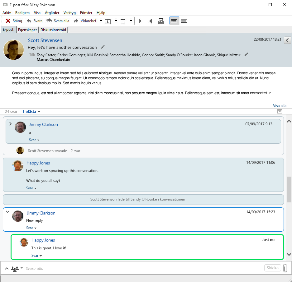 Nya svar i konversationen har en grön ram. De förblir gröna i 3 minuter efter att du har läst meddelandet. Du kan radera olästa objekt från ett objekt i objektlistan genom att högerklicka på det gröna numret för olästa meddelanden bredvid objektet.