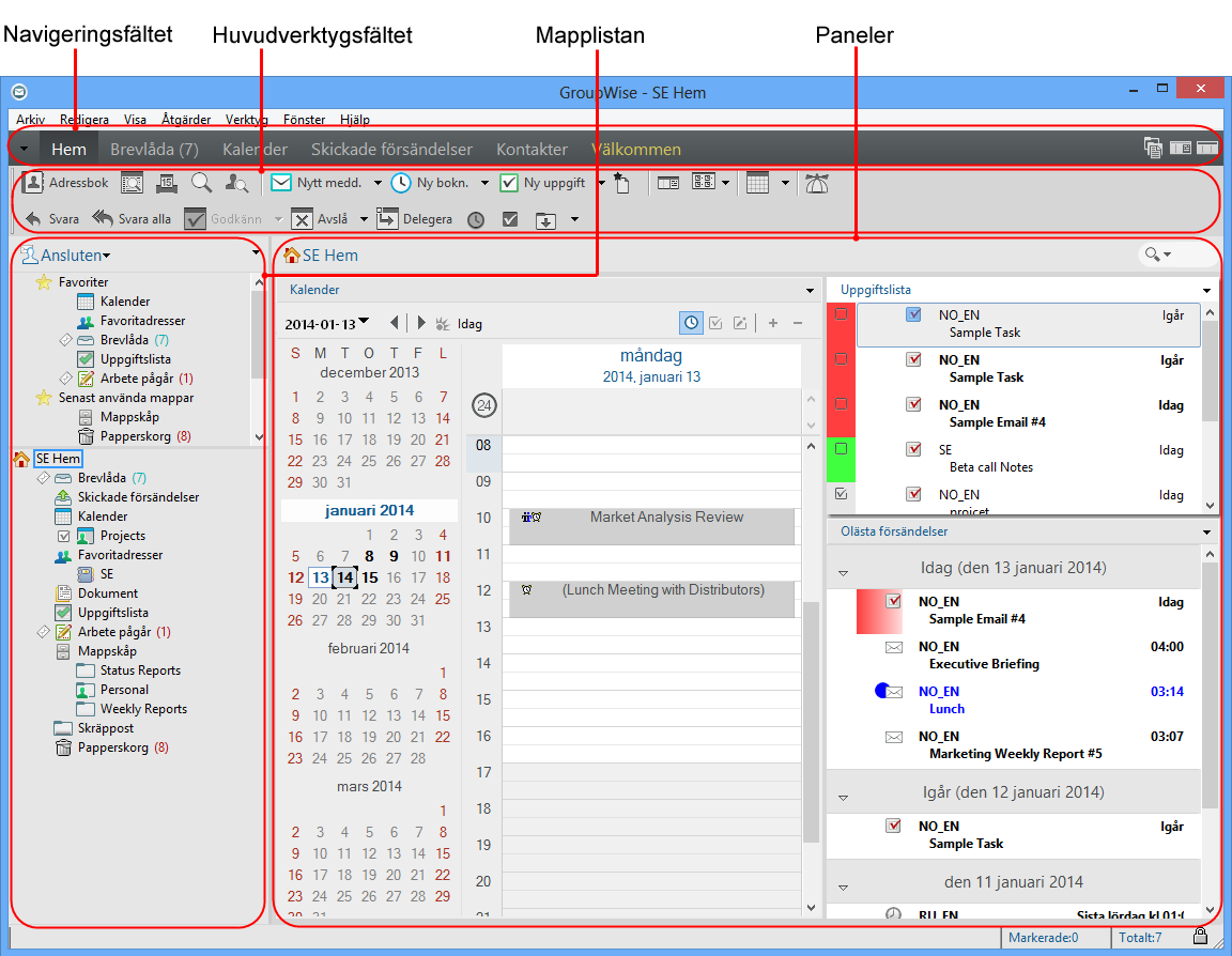 Det mesta arbetet i GroupWise utför du i huvudfönstret. I huvudfönstret kan du bland annat läsa meddelanden, schemalägga bokningar, visa kalendern, hantera kontakter, växla arbetsläge för GroupWise, öppna mappar och öppna dokument.