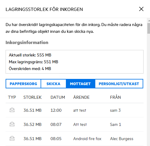 Om du försöker skicka en e-postförsändelse som gör att du överskrider lagringsgränsen så kommer du att meddelas med en prompt. Information om hur du minskar storleken på din postbrevlåda finns i Minska postlådebrevlådans storlek.