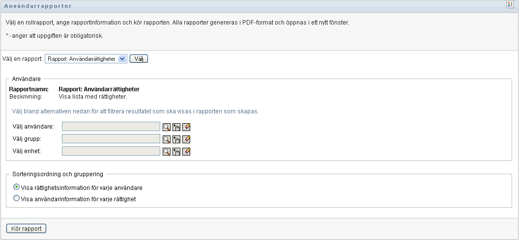 Figur 19-4 Exempel på Rapport: Användarrättigheter: Rättighetsinformation för varje användare