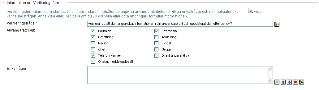 I fältet kan du också inkludera ytterligare frågor som en verifierare kan besvara under en verifieringsprocess. Verifieringsprocessen måste inte innehålla enkätfrågor. Men om de finns med kan de besvaras av verifieraren.