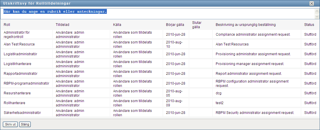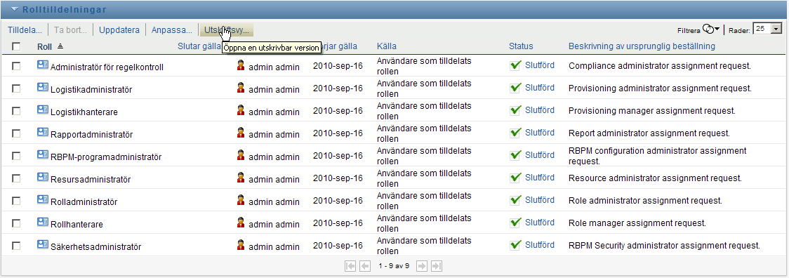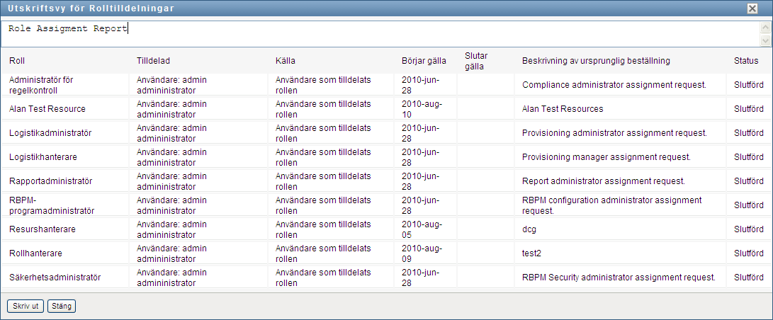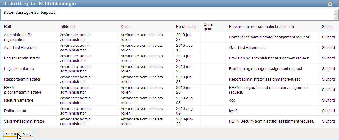 I användarprogrammet visas en utskrivbar version av listan med rolltilldelningar i ett separat fönster: