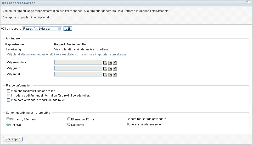 2. Ange Rapport: Användarroller i rullgardinsmenyn Välj en rapport och klicka på Välj.