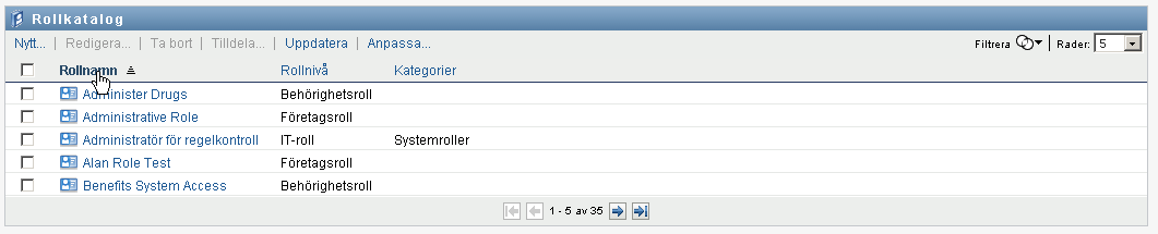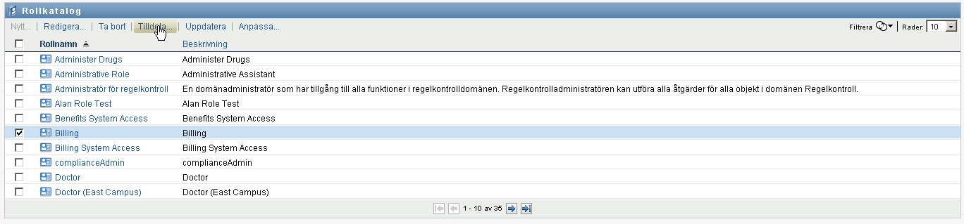 En lista med de roller som för tillfället är definierade i katalogen visas i användarprogrammet.