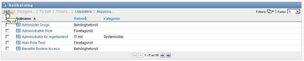 Åtgärden på fliken i Identity Manager gör att du kan visa roller som har definierats i katalogen tidigare. Det gör också att du kan skapa nya roller och ändra, ta bort och tilldela befintliga roller.
