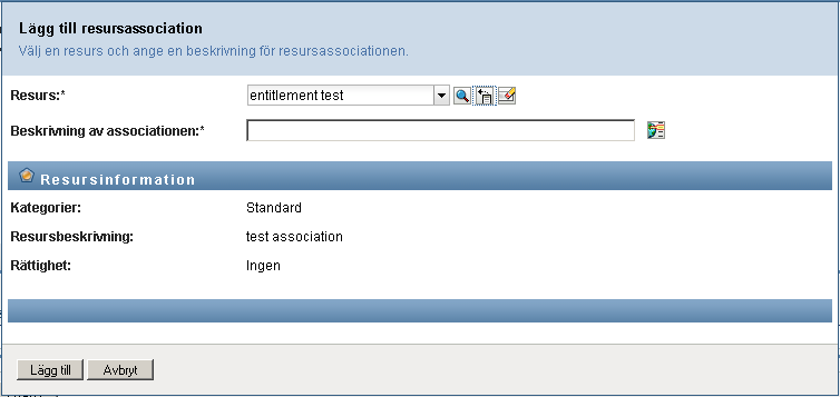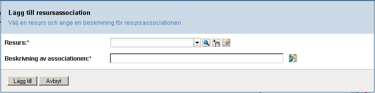 Använd objektväljaren för att välja en resurs och ange text som förklarar orsaken till associationen.