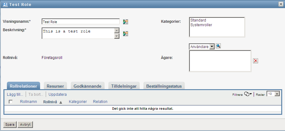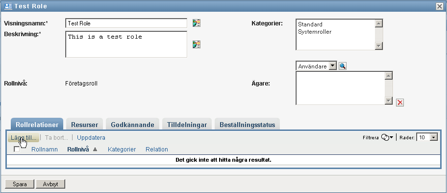 Roller på lägsta nivå (behörighetsroller) kan ingå i roller på högre nivå, men de kan inte innehålla andra roller på lägsta nivå. På sidan Rollrelation kan du endast lägga till en roll på högre nivå.
