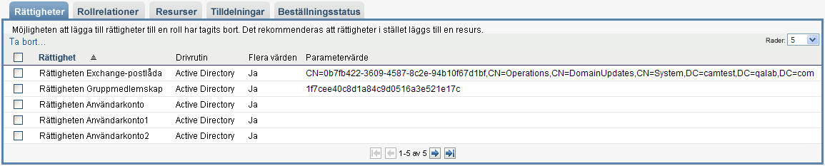 Rättigheter som är associerade med befintliga roller. Roller som har definierats i tidigare version av den rollbaserade logistikmodulen kan ha associerade rättigheter. Om en roll har en associerad rättighet visas fliken där du kan se rättighetsmappning och ta bort den om du vill. Rättighetsmappning för roller fungerar fortfarande i den här versionen, men Novell rekommenderar nu att du associerar rättigheter med resurser i stället för med roller.