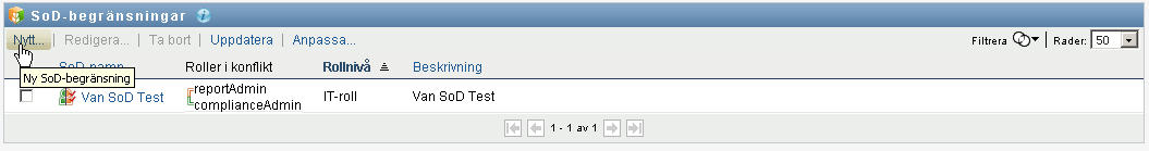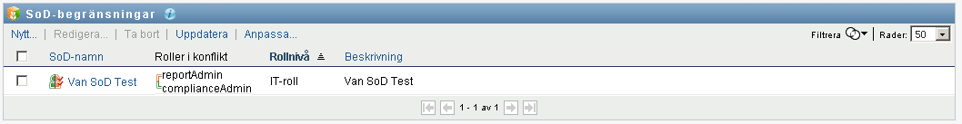 En lista med de SoD-begränsningar som för tillfället är definierade i katalogen visas i användarprogrammet.