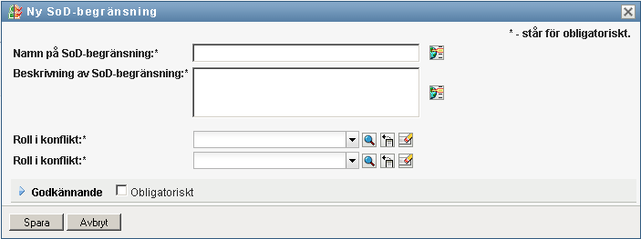 Markera den här rutan om SoD-begränsningen måste godkännas för undantag. Avmarkera den här rutan om SoD-begränsningen inte behöver godkännas för undantag. |