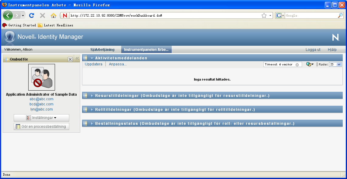 Programmet uppdateras och du återförs till åtgärden som är standardåtgärden när du loggar in. Aktivitetslistan innehåller aktiviteter som har tilldelats till användaren som du har en fullmakt från. Ovanför gruppen (samt i rubrikraden) visas ett meddelande om att du nu har en fullmakt från en annan användare.