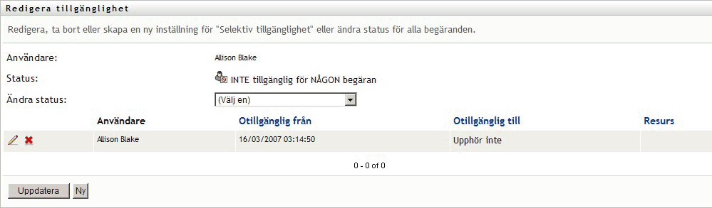 Sidan Frånvaro visas. Om du inte har angett några befintliga tillgänglighetsinställningar är visningslistan tom: