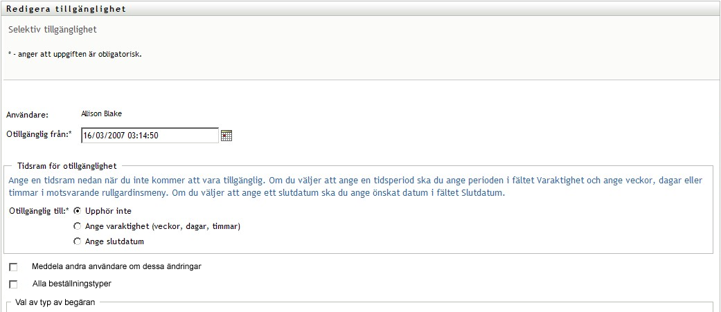 Ange tidsperioden då du inte är tillgänglig: