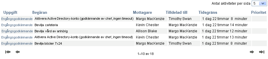 Med mallvisningen kan du sortera kolumner efter värde, ange antalet aktiviteter per sida samt bläddra genom aktivitetslistan.