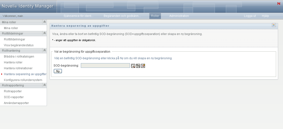 Behörighet till sidan Rolladministratören och den säkerhetsansvariga personen har behörighet till sidan Hantera uppgiftsseparation. Den som är säkerhetsansvarig måste ha bläddringsbehörighet för containern SODDef i identitetsarkivet, men ingen bläddringsbehörighet för roller krävs.