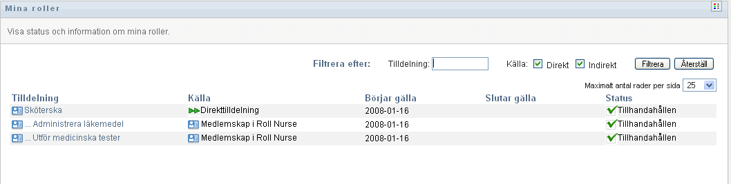 I användarprogrammet visas aktuell status för rolltilldelningarna för användaren som är autentiserad för tillfället.